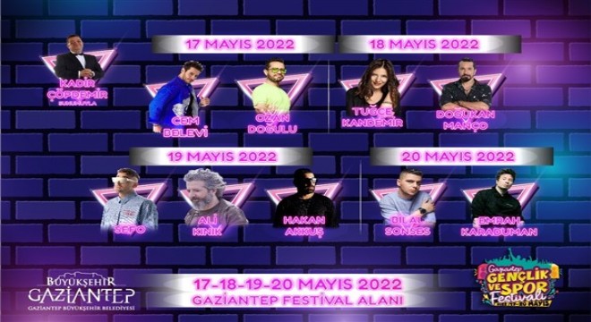 Gaziantep Gençlik ve Spor Festivali’nde ayrıca sanatçıları ağırlayacak. Kadir Çöpdemir’in eşsiz sunumuyla 17 Mayıs Günü Cem Belevi ve Ozan Doğulu sevenleriyle buluşacak. Festivalin ikinci günü 18 Mayıs’ta Tuğçe Kandemir ve Doğukan Manço sahne alacak. 19 Mayıs Atatürk’ü Anma Gençlik ve Spor Bayramı’nda ise ünlü şarkıcılar Sefo, Ali Kınık ve Hakan Akkuş sevilen şarkılarını Gazi şehrin gençleri için söyleyecek. Festivalin son günü ise Bilal Sonses ve Emrah Karaduman kapanışı yapacak.